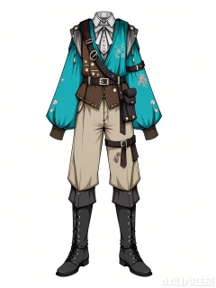 FSSJ, Digital drawing of a fantasy outfit, featuring a turquoise tunic with silver thread patterns and a mandarin collar, paired with beige breeches tucked into black leather boots. The tunic has a brown leather vest with metal buttons, and a sword belt crossing the chest. The outfit has a swashbuckling, pirate-inspired style with a mix of bright and neutral colors. The background is plain white. The drawing is detailed and stylized, with a focus on texture and intricate design elements.