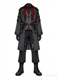 FSSJ, Digital drawing of a fantasy outfit, featuring a charcoal gray trench coat with red lining and a high collar, paired with black leather pants and combat boots. The coat has a belt with pouches, and a holster with a pistol on the thigh. The outfit has a steampunk, action-hero style with dark and bold colors. The background is plain white. The drawing is detailed and stylized, with a focus on texture and intricate design elements.
