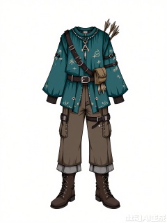 FSSJ, Digital drawing of a fantasy outfit, featuring a teal tunic with silver thread embroidery and a round neck, paired with brown leather pants and boots. The tunic has a leather belt with a pouch, and a quiver of arrows on the back. The outfit has a hunter, woodland style with cool and earthy tones. The background is plain white. The drawing is detailed and stylized, with a focus on texture and intricate design elements.