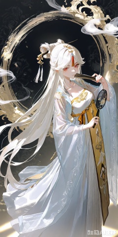fuzhuang,fuzhuang,chinese clothes,dress,1girl,hanfu,long sleeves,standing,see-through,wide sleeves,jewelry,yellow dress,white dress,depth of field,holding,hand fan,facing viewer,
