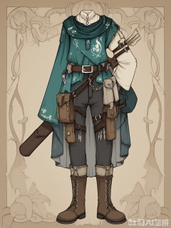 FSSJ, Digital drawing of a fantasy outfit, featuring a teal tunic with silver thread embroidery and a round neck, paired with brown leather pants and boots. The tunic has a leather belt with a pouch, and a quiver of arrows on the back. The outfit has a hunter, woodland style with cool and earthy tones. The background is plain white. The drawing is detailed and stylized, with a focus on texture and intricate design elements.