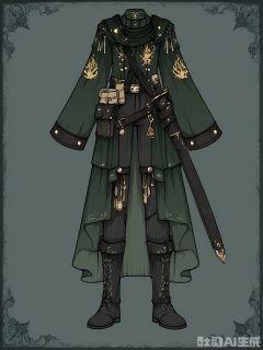 FSSJ, Digital drawing of a fantasy outfit, featuring a dark green duster coat with brass buttons and a wide collar, paired with black leather pants and knee-high boots. The coat has a belt with pouches, and a sword sheath hanging at the hip. The outfit has a western, outlaw style with dark and rugged colors. The background is plain white. The drawing is detailed and stylized, with a focus on texture and intricate design elements.