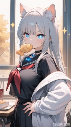 masterpiece, best quality, amazing quality, very aesthetic, absurdres, newest,1girl, solo, long hair, looking at viewer, bangs, blue eyes, skirt, shirt, long sleeves, animal ears, school uniform, jacket, grey hair, pleated skirt, food, open clothes, serafuku, choker, cat ears, black skirt, sailor collar, off shoulder, v-shaped eyebrows, neckerchief, animal ear fluff, black shirt, sparkle, bell, mouth hold, white jacket, cardigan, jingle bell, neck bell, black sailor collar, hands on hips, black serafuku, food in mouth, wagashi, taiyaki,glowing tattoo