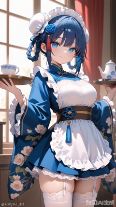 masterpiece, best quality, amazing quality, very aesthetic, absurdres, newest,1girl, solo, frills, maid headdress, tray, curtains, thighhighs, holding, teapot, maid, holding tray, wide sleeves, window, frilled sleeves, dress, cup, looking at viewer, apron, white thighhighs, tassel, blue hair, white dress, long sleeves, sidelocks, hair ornament, hair bun, closed mouth, double bun, teacup, braid, smile, indoors, frilled dress, blue eyes, bun cover, frilled apron, long hair, hair rings, cowboy shot, maid apron, white apron, blurry, garter straps, standing, floral print, blurry background, zettai ryouiki, braided hair rings, tassel hair ornament, dark blue hair, light particles, blush, lace trim, hair flower, wa maid, chinese clothes, cross-laced footwear, flower, twitter username, twin braids, lolita fashion