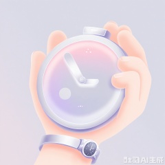 3DMS, A digital illustration of a stylized wristwatch, rendered in a soft, pastel color palette. The watch face is primarily light gray with a smooth gradient effect, giving it a sophisticated and understated appearance. The hour markers are simple lines in a pale pink hue, and the hands of the watch are slender and metallic silver. The strap is a soft lavender color, wrapping comfortably around an imaginary wrist. The background is a clean, white gradient, enhancing the watch’s elegant design. The overall style is minimalist and timeless, with a focus on subtle details and gentle colors.