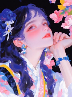 BAI, This digital painting features a serene, ethereal woman with long, flowing dark blue hair and fair skin. She wears a blue kimono adorned with pink cherry blossoms. Her expression is contemplative, with one hand resting thoughtfully on her cheek. The background is a deep black, accentuating her delicate features and the vibrant colors of her attire.