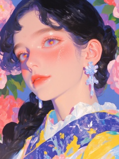 BAI,baibai,This is a digital painting of a young woman with fair skin and long,wavy black hair styled in a side braid. She wears a vibrant floral kimono with blue,yellow,and white patterns. Her large,expressive eyes and rosy cheeks are highlighted by soft lighting. Pink flowers and green leaves form the background,