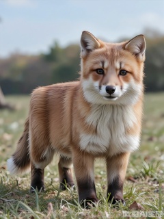 FXDW, Photo of a small, fluffy red fox cub standing on a grassy meadow, looking directly at the camera with wide, innocent amber eyes. The fox has a bushy tail and white markings on its muzzle and chest. The background features a line of distant trees and a clear blue sky, suggesting a rural landscape. The grass is lush and green, contrasting with the fox's fiery fur. The fox is standing on all fours, with its ears perked up. The lighting is bright and natural, indicating a sunny afternoon.