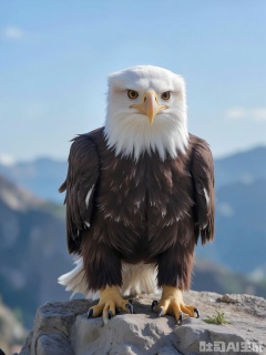 FXDW, Photo of a majestic bald eagle perched on a rocky cliff edge, staring directly at the camera with piercing yellow eyes. The eagle has a powerful build and outstretched wings. The background features a vast expanse of blue sky and distant mountains, suggesting a rugged wilderness. The rocks are rough and gray, contrasting with the eagle's dark feathers and white head. The eagle is standing tall, with its chest puffed out. The lighting is sharp and clear, indicating a midday sun.