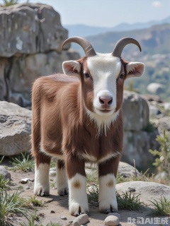 FXDW, Photo of a friendly brown and white goat standing on a rocky hillside, looking at the camera with gentle, expressive eyes. The goat has a beard and curved horns. The background features a rugged landscape with boulders and a distant valley, suggesting a mountainous region. The rocks are rough and gray, contrasting with the goat's soft fur. The goat is standing on all fours, with its head tilted slightly. The lighting is crisp and clear, indicating a midday sun.