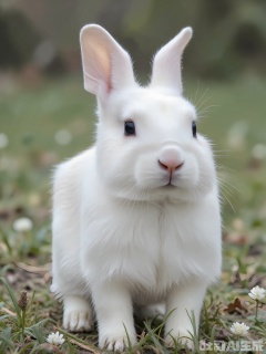 FXDW, Photo of a tiny, fluffy white bunny sitting in a patch of clover, looking at the camera with soft, pink-rimmed eyes. The bunny has long ears and a cotton-ball tail. The background features a meadow filled with green grass and wildflowers, suggesting a peaceful countryside. The clover is bright green and dotted with tiny white flowers, contrasting with the bunny's pure white fur. The bunny is sitting upright, with its front paws resting in front of it. The lighting is gentle and natural, indicating a morning dew.