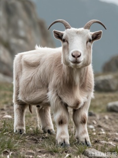 FXDW, Photo of a friendly brown and white goat standing on a rocky hillside, looking at the camera with gentle, expressive eyes. The goat has a beard and curved horns. The background features a rugged landscape with boulders and a distant valley, suggesting a mountainous region. The rocks are rough and gray, contrasting with the goat's soft fur. The goat is standing on all fours, with its head tilted slightly. The lighting is crisp and clear, indicating a midday sun.