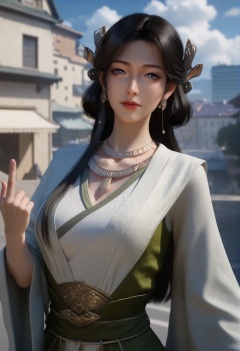 (score_9),<lora:梅凝1-Apony:0.85>,mn,(mature_female:1.1),solo,hair ornament,long hair,black hair,jewelry,earrings,necklace,long long sleeves,robe,<lora:perfect eyes_v1:0.8>,front view,bright pupils,<lora:Expressive_H-000001:0.8>,(middle_finger:1.1),outstretched_arm,upper body, (glamor:1.2),collarbone,pointy breasts,puffy breasts,large breasts,narrow waist,curvy,outdoors,street,blue sky,blur background,building,city,cloud,cloudy sky,day,depth of field,(white_skin:1.1),(fair_skin:1.1),