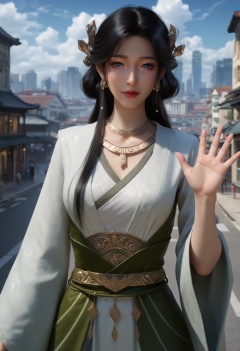 (score_9),<lora:梅凝1-Apony:0.85>,mn,(mature_female:1.1),solo,hair ornament,long hair,black hair,jewelry,earrings,necklace,robe,belt,long long sleeves,<lora:perfect eyes_v1:0.8>,front view,bright pupils,<lora:Expressive_H-000001:0.8>,(waving:1.1),(glamor:1.2),collarbone,pointy breasts,puffy breasts,large breasts,narrow waist,curvy,outdoors,street,blue sky,blur background,building,city,cloud,cloudy sky,day,depth of field,(white_skin:1.1),(fair_skin:1.1),