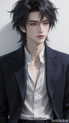 For the outfit, choose a style that’s formal yet relaxed! Wear a dark - colored suit, and pair it with a white shirt inside. Don’t button it all the way up; leave it slightly open to show a bit of the chest, looking casual and stylish. The background should be simple and clean, like a pure - colored white wall. The lighting is soft, making the character stand out more. The overall picture should be delicate and textured, like the atmosphere of a high - quality magazine photo shoot.