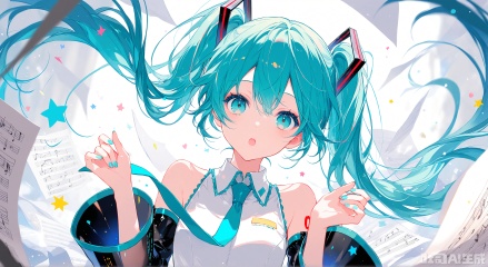 1girl, solo, long hair, looking at viewer, open mouth, shirt, twintails, upper body, detached sleeves, necktie, sleeveless, star \(symbol\), nail polish, :o, aqua eyes, hands up, sleeveless shirt, aqua hair, floating hair, paper, sheet music, hatsune miku