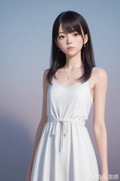 a young woman with long, dark hair, wearing a white dress and a silver necklace, set against a blue gradient background,