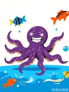 ETTY, A playful, scribbly illustration of a purple octopus with a big, silly grin. The octopus is floating in the ocean, its tentacles waving around like they’re dancing. The scene includes colorful fish, wavy blue water, and a few floating bubbles, all drawn with bold, uneven lines and filled in with vibrant hues.