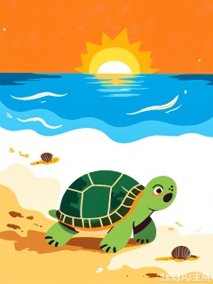 ETTY, A funny, rough-drawn cartoon of a green turtle with a patterned shell. The turtle is slowly crawling on a sandy beach, leaving wavy footprints behind it. The scene includes a wavy blue ocean, a few floating seashells, and a distant orange sunset, all drawn with bold, uneven lines and filled in with vibrant, playful colors.