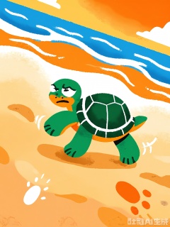 ETTY, A funny, rough-drawn cartoon of a green turtle with a patterned shell. The turtle is slowly crawling on a sandy beach, leaving wavy footprints behind it. The scene includes a wavy blue ocean, a few floating seashells, and a distant orange sunset, all drawn with bold, uneven lines and filled in with vibrant, playful colors.