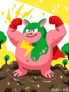 ETTY, A bubbly, hand-drawn picture of a pink piglet wearing a red superhero cape. The piglet is standing on a pile of mud, flexing its tiny arms and grinning proudly. The background has floating stars, a yellow lightning bolt, and a green hill with a single tree, all outlined in black and colored in with bright, messy patches.