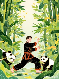 XSGC, Digital illustration of a mystical bamboo forest with a martial artist wearing a black uniform and a red sash, practicing kung fu among the bamboo stalks. The forest is filled with sunlight filtering through the leaves, creating a dappled effect on the ground. The sky is a light green and a panda is munching on bamboo. The colors are earthy and the style is new Chinese national trend with a dynamic energy.