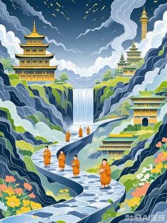 XSGC, Digital illustration of a serene mountain monastery with a stone pathway in the foreground, featuring monks in saffron robes walking in meditation. The monastery is nestled among the clouds, with prayer flags fluttering in the breeze and incense smoke curling upwards in shades of gray and white. A waterfall cascades down the mountainside, its sound echoing through the valley. The background is a deep blue sky with a few wispy clouds. The pathway is lined with wildflowers and moss-covered rocks in shades of green and yellow. The illustration style is peaceful and spiritual, with a new-Chinese reverence for nature and inner peace.