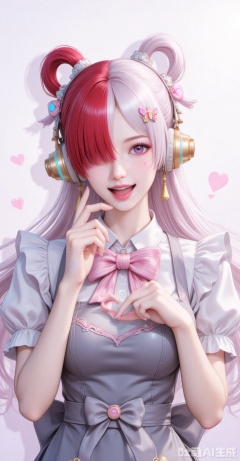 1girl,solo,bandaid on hand,butterfly hair ornament,heart,long hair,apron,open mouth,pink bowtie,hair ornament,white background,pink bow,short sleeves,dress,simple background,bow,striped bow,hair between eyes,bandaid,shadow,puffy sleeves,frills,puffy short sleeves,heart hands,bowtie,hands up,grey apron,smile,looking at viewer,striped bowtie,symbol-shaped pupils,heart-shaped pupils,symbol in eye,tongue,grey bow,