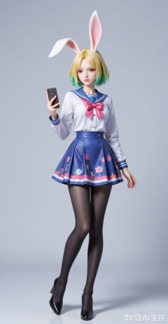 1girl, pantyhose, solo, school uniform, skirt, phone, selfie, cellphone, serafuku, smartphone, holding phone, black pantyhose, high heels, full body, holding, bow, crossed legs, standing, 3/4 view,