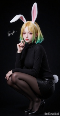 1girl,solo,pantyhose,high heels,looking at viewer,black footwear,squatting,sweater,quad tails,full body,parted lips,black sweater,earrings,signature,black nails,long sleeves,parted bangs,jewelry,pencil skirt,skirt,bangs,turtleneck,nail polish,black pantyhose,dress,(Black background:1.2),simple background,
