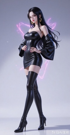 1girl,solo,dress,earrings,jewelry,black hair,boots,long hair,hand on own hip,thigh boots,full body,black footwear,latex,black dress,detached sleeves,bare shoulders,strapless,short dress,thighhighs,shiny clothes,looking at viewer,strapless dress,standing,hoop earrings,breasts,red lips,nail polish,high heels,leather,pencil dress,high heel boots,