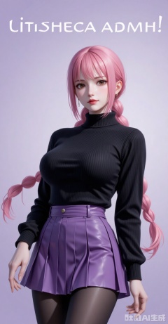 1girl,pantyhose,breasts,skirt,solo,ass,large breasts,bangs,black pantyhose,looking at viewer,purple skirt,black sweater,long sleeves,underwear,sweater,turtleneck,pleated skirt,black shirt,