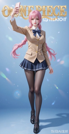 1girl, pantyhose, solo, school uniform, skirt, phone, selfie, cellphone, serafuku, smartphone, holding phone, black pantyhose, high heels, full body, holding, bow, crossed legs, standing, 3/4 view,