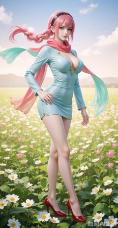 1girl,breasts,solo,flower field,cleavage,scarf,flower,high heels,field,dress,large breasts,hairband,jewelry,long sleeves,outdoors,full body,closed mouth,short dress,red footwear,earrings,looking at viewer,sky,black hairband,
