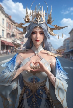 (score_9),<lora:宁雨蝶-apony:0.83>,nyd,(mature_female:1.1),solo,hair ornament,tiara,long hair,hair bun,mole under eye,shoulder guard,high collar,detached collar,detached sleeves,dress,circlet,jewelry,dangle earrings,<lora:perfect eyes_v1:0.8>,blue eyes,front view,<lora:Expressive_H-000001:0.8>,((heart hands)),glamor,collarbone,pointy breasts,puffy breasts,large breasts,outdoors,street,blue sky,blur background,building,city,cloud,cloudy sky,day,depth of field,(white_skin:1.1),(fair_skin:1.1),