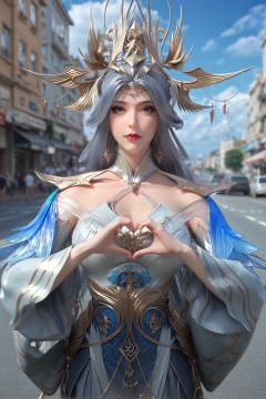 (score_9),<lora:宁雨蝶-apony:0.8>,nyd,(mature_female:1.1),solo,hair ornament,tiara,long hair,hair bun,mole under eye,shoulder guard,high collar,detached collar,detached sleeves,dress,circlet,jewelry,dangle earrings,<lora:perfect eyes_v1:0.8>,blue eyes,front view,<lora:Expressive_H-000001:0.8>,((heart hands)),glamor,collarbone,pointy breasts,puffy breasts,large breasts,outdoors,street,blue sky,blur background,building,city,cloud,cloudy sky,day,depth of field,<lora:e肤色滑块:0.5>,(white_skin:1.1),(fair_skin:1.1),