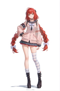 8k,best quality,masterpiece,(ultra-detailed),(high detailed skin),((artist:reoen),(artist:fuzichoco),(artist:atdan),(artist:torino_aqua),year 2024:0.8)1girl,[artist:wlop],[artist:ningen_mame],artist:ciloranko,[[artist:rhasta]],artist:tidsean,colorful,jijia,2d,ambient light,full body,full shot,standing,looking at viewer,(solo:1.2),simple background,(white background:1.2),hand on own hip,(white background:1.1),<lora:fuaizzz-ill-Tanger:0.8>,Ukinami Yuzuha \(Zenless Zone Zero\),clothes: Yuzuhadef clothes,single thighhigh,1girl,solo,long hair,red hair,striped,boots,Yuzuhadef skirt,looking at viewer,cardigan,very long hair,simple background,bangs,asymmetrical legwear,long sleeves,choker,twin braids,white bow,