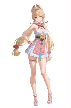 8k,best quality,masterpiece,(ultra-detailed),(high detailed skin),((artist:reoen),(artist:fuzichoco),(artist:atdan),(artist:torino_aqua),year 2024:0.8)1girl,[artist:wlop],[artist:ningen_mame],artist:ciloranko,[[artist:rhasta]],artist:tidsean,colorful,jijia,2d,ambient light,full body,full shot,standing,looking at viewer,(solo:1.2),simple background,(white background:1.2),hand on own hip,(white background:1.1),<lora:fuaizzz-ill-Tanger:0.8>,Alice Thymefield \(Zenless Zone Zero\),clothes: Alicesw swimsuit,heterochromiam,red eye,yellow eye,Alicesw pink and white dress,1girl,long hair,blonde hair,breasts,twintails,bracelet,low twintails,pink thigh strap,