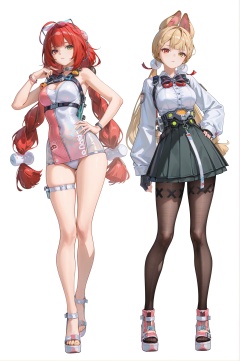 8k,best quality,masterpiece,(ultra-detailed),(high detailed skin),((artist:reoen),(artist:fuzichoco),(artist:atdan),(artist:torino_aqua),year 2024:0.8)1girl,[artist:wlop],[artist:ningen_mame],artist:ciloranko,[[artist:rhasta]],artist:tidsean,colorful,jijia,2d,ambient light,full body,full shot,standing,looking at viewer,simple background,(white background:1.2),hand on own hip,(white background:1.1),<lora:fuaizzz-ill-Tanger:0.8>,2girls,Alice Thymefield \(Zenless Zone Zero\),clothes: Alicedef clothes,heterochromiam,red eye,yellow eye,Alicedef white shirt,1girl,solo,pantyhose,long hair,Alice animal ears,blonde hair,heterochromia,Alicedef black skirt,twintails,breasts,gloves,black pantyhose,bow,Ukinami Yuzuha \(Zenless Zone Zero\),clothes: Yuzuhasw swimsuit,Yuzuhasw pink mini dress,1girl,bare legs,long hair,twin braids,braid,green eyes,breasts,red hair,jewelry,bracelet,bangs,Yuzuhasw thigh strap,eyewear on head,