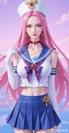 1girl,sailor senshi uniform,solo,jewelry,skirt,gloves,earrings,blue skirt,white gloves,sailor collar,bow,breasts,choker,elbow gloves,magical girl,back bow,covered navel,pleated skirt,looking at viewer,brooch,purple bow,heart brooch,red choker,miniskirt,closed mouth,large breasts,collarbone,red gemstone,tiara,cowboy shot,