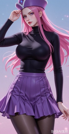 1girl,breasts,skirt,solo,pantyhose,large breasts,purple skirt,covered navel,long sleeves,taut clothes,miniskirt,pleated skirt,turtleneck,black shirt,shirt,black pantyhose,taut shirt,