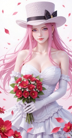 elbow_gloves,frilled_skirt,holding_bouquet,highres,cherry_blossoms,strapless_dress,white_gloves,looking_at_viewer,red_flower,solo,collarbone,own_hands_together,:d,white_background,backlighting,black_bow,bare_shoulders,frilled_dress,hair_bow,wedding_dress,commentary_request,1girl,petals,simple_background,blush,cowboy_shot,