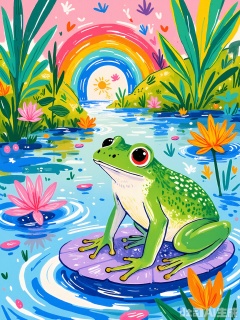 ZSCQ, A lively green frog with bulging eyes and webbed feet, perched on a purple lily pad, amidst a pond filled with vibrant, abstract water plants. The backdrop showcases a pink and orange sky with a whimsical rainbow arching over. The scene is bursting with energy and playfulness, rendered in a bold, graffiti-inspired colored pencil style.