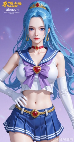 1girl,sailor senshi uniform,solo,jewelry,skirt,gloves,earrings,blue skirt,white gloves,sailor collar,bow,breasts,choker,elbow gloves,magical girl,back bow,covered navel,pleated skirt,looking at viewer,brooch,purple bow,heart brooch,red choker,miniskirt,closed mouth,large breasts,collarbone,red gemstone,tiara,cowboy shot,
