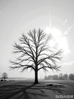 HBYS, A black and white photograph of a solitary tree standing in an open field. The tree is highlighted by a stark, angular light source, casting dramatic shadows across the ground. The branches are bare, suggesting a winter scene, with a sense of resilience and endurance. The image is minimalist, focusing on the interplay of light, shadow, and form.