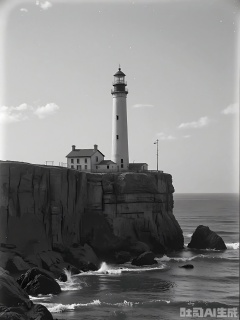 HBYS, A black and white photograph of a solitary lighthouse standing on a rocky coastline. The lighthouse is illuminated by its own powerful beam, cutting through the darkness and reaching out to sea. The surrounding landscape is rugged and desolate, with waves crashing against the rocks. The image is dramatic and awe-inspiring, with a strong sense of scale and isolation.