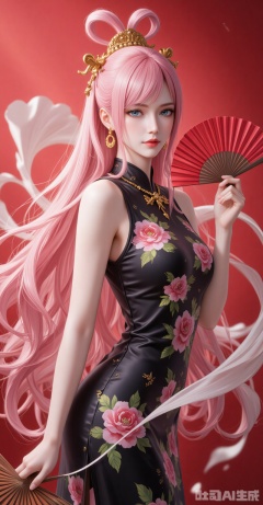 1girl,dress,hand fan,holding,solo,earrings,jewelry,chinese clothes,china dress,black dress,holding fan,floral print,blurry,sleeveless,looking at viewer,sleeveless dress,red background,folding fan,standing,head tilt,2,