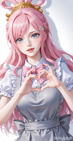 1girl,solo,bandaid on hand,butterfly hair ornament,heart,long hair,apron,open mouth,pink bowtie,hair ornament,white background,pink bow,short sleeves,dress,simple background,bow,striped bow,hair between eyes,shadow,puffy sleeves,frills,puffy short sleeves,heart hands,bowtie,hands up,grey apron,smile,looking at viewer,striped bowtie,symbol-shaped pupils,heart-shaped pupils,symbol in eye,grey bow,