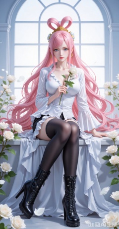 1girl,flower,solo,breasts,thighhighs,hair flower,high heels,boots,sitting,rose,white flower,window,hair ornament,cleavage,holding flower,black footwear,black thighhighs,high heel boots,single thighhigh,shirt,holding,white rose,looking at viewer,hairband,white shirt,frills,full body,black flower,
