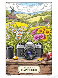 BSCT, A detailed, colorful print illustration highlighting a vintage camera labeled "Moments Captured" at its center, encircled by film reels and a bouquet of wildflowers on a weathered wooden table. The backdrop reveals a scenic countryside with rolling hills, a windmill, and a distant farmhouse. The style is inspired by vintage travel posters, with delicate linework and vibrant hues. The overall mood is nostalgic and adventurous, combining the art of photography with pastoral beauty.